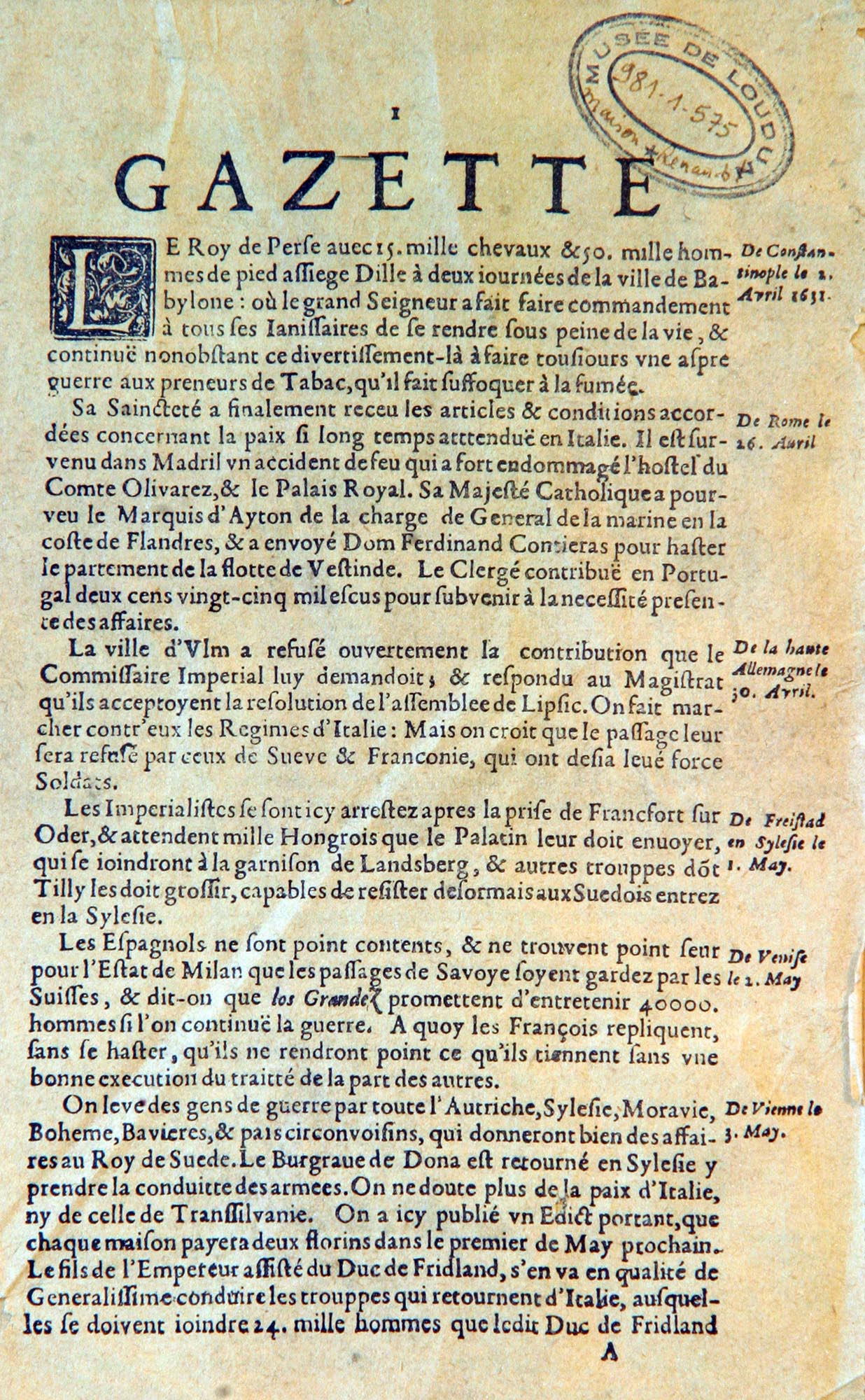 On considère que la presse périodique française est née avec cette Gazette, dont le rythme de parution est hebdomadaire. Renaudot y met sa plume au service du pouvoir. Il jouit de la protection royale et le 11 octobre 1631, il obtient confirmation du privilège de la Gazette.